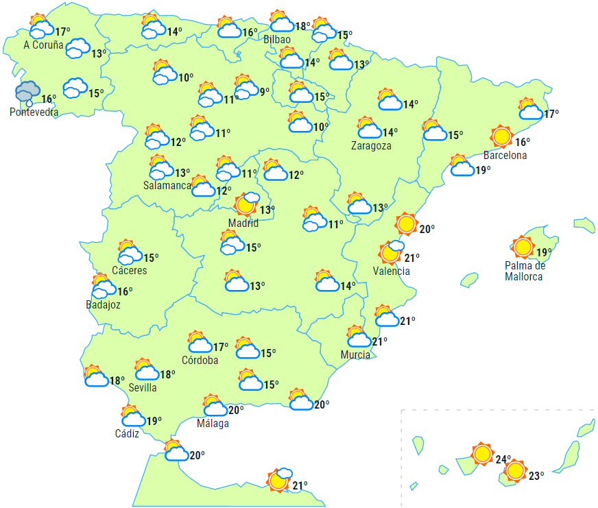 Dagstemperaturerne stiger ved Middelhavets kyster, i Ebro-dalen og i nordvest, mens de falder i Pyrenæerne og i de indre egne i sydøst. Kun få ændringer i resten af landet. Faldende nattemperaturer i Pyrenæerne, mens de stiger på resten af den østlige halvdel af fastlandet og kun små ændringer i resten. Let frost i Pyrenæerne.