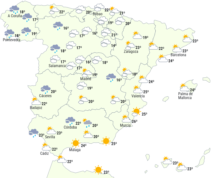 Nedbør forventes til størstedelen af den nordvestlige halvdel af halvøen, såvel som i Strædet, Béticas og lokalt i det nordlige Middelhavsområde - muligvis også i de nordlige dele af De Baleariske Øer.