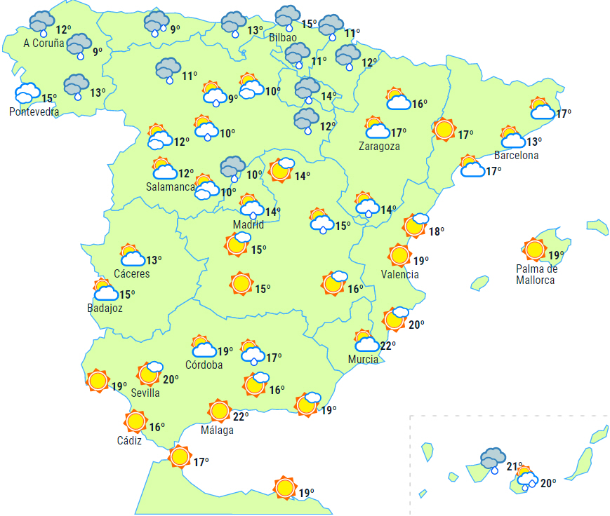 Overvejende letskyet himmel over resten af halvøen, dog med lavthængende morgenskyer over den vestlige del af den sydlige højslette og Andalusien og i løbet af eftermiddagen også i det indre af den sydøstlige del af halvøen, som kan give enkelte byger.