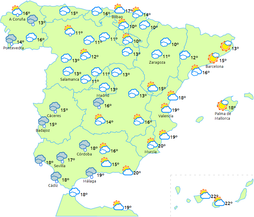 Overvejende skyet eller overskyet himmel over halvøen med nedbør, der breder sig fra vest til øst fra Atlanterhavssiden af halvøen. Lokalt vedvarende nedbør til den vestlige del af bjergene i de indre egne og i Andalusien, mens den vil være svagere i den østlige del.
