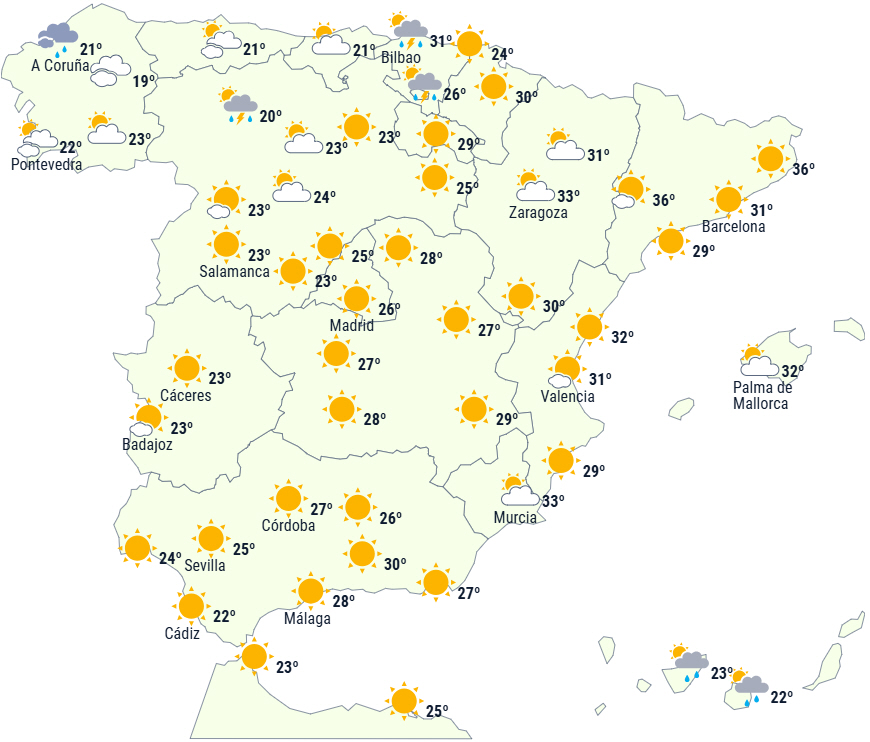 Dagstemperaturerne forventes at stige på den nordlige del af Galicien og Cantabrien og endda markant på den østlige halvdel. Der forventes ingen ændringer på den nordøstlige del eller på øgrupperne, mens de falder i resten - især på den vestlige halvdel. Alligevel forventes det at blive 34 til 36 grader i det østlige Andalusien, på De Baleariske Øer samt på den sydøstlige og nordøstlige del af Den Iberiske Halvø. Vi kan endda ramme 38 til 40 grader i dalene i nordøst og i det østlige Andalusien.
