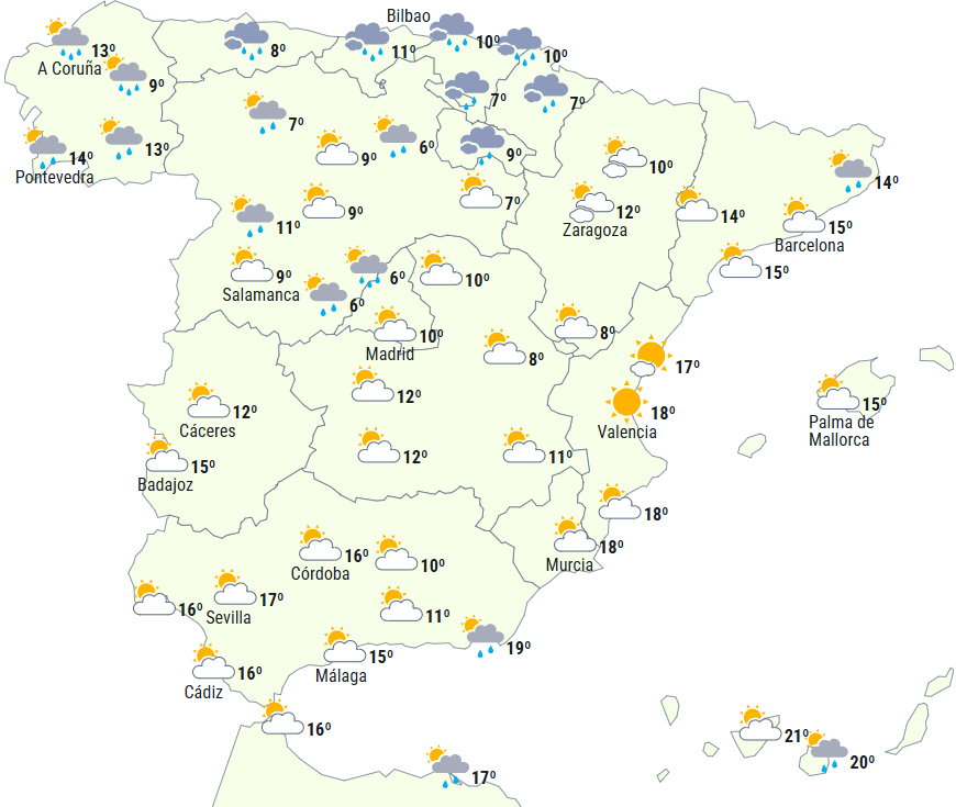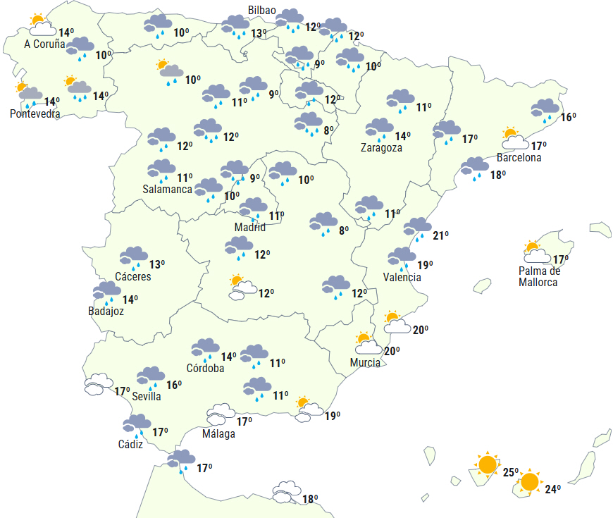 En front forbundet med et lavtryk beliggende over det vestlige Europa vil give let til tungt skydække over halvøen og rigeligt med højtliggende skyer over De Baleariske Øer. Under sit passage sender den betydelige nedbørsmængder ned over nordvest, som i løbet af eftermiddagen vil brede sig sydpå, dog i en mindre intens udgave, men det kan dog alligevel blive vedvarende i det centrale højland og det nordlige af De Iberiske Bjerge. Ved dagens afslutning kan regnen nå De Baleariske Øer.