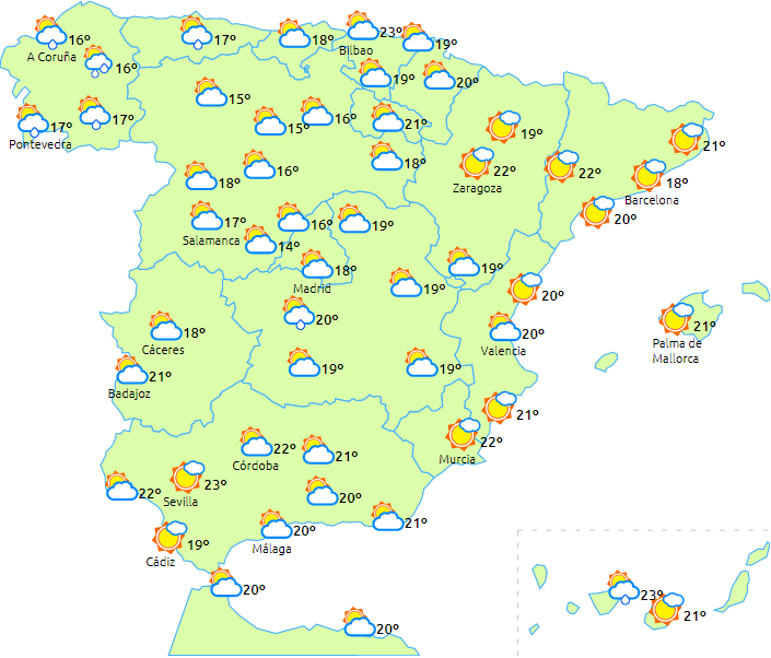 På De Kanariske Øer vil den sydlige ende af en front giver overskyet himmel i perioder og let regn, som vil bevæge sig fra vest til øst. Det skulle dog holde tørt på de østligste øer.