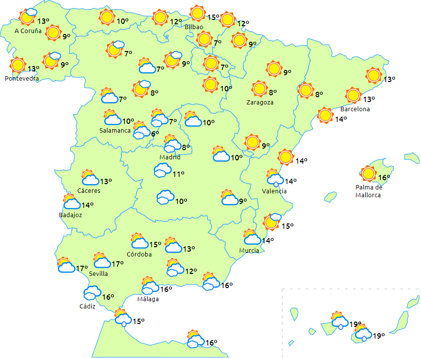 I halvøens indre egne og på Balearerne nogle perioder med lavthængende skyer, mens der kan komme nogle højtliggende skyer af og til over den sydvestlige del af halvøen.