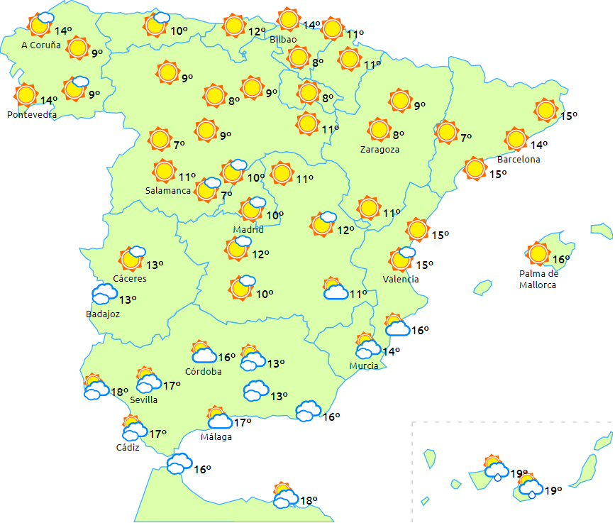 Generelt sker der ikke det helt vilde med temperaturerne bortset fra stigende dagstemperaturer i de sydlige indre egne og faldende dagstemperaturer på De Kanariske Øer. Nætterne bliver også en smule lunere i den sydøstlige del af landet. Frost er begrænset til den indre del af den nordlige halvdel af halvøen og lokal frost i sydøst. Koldest bliver det i områderne på den nordlige højslette, De Iberiske Randbjerge og Pyrenæerne.