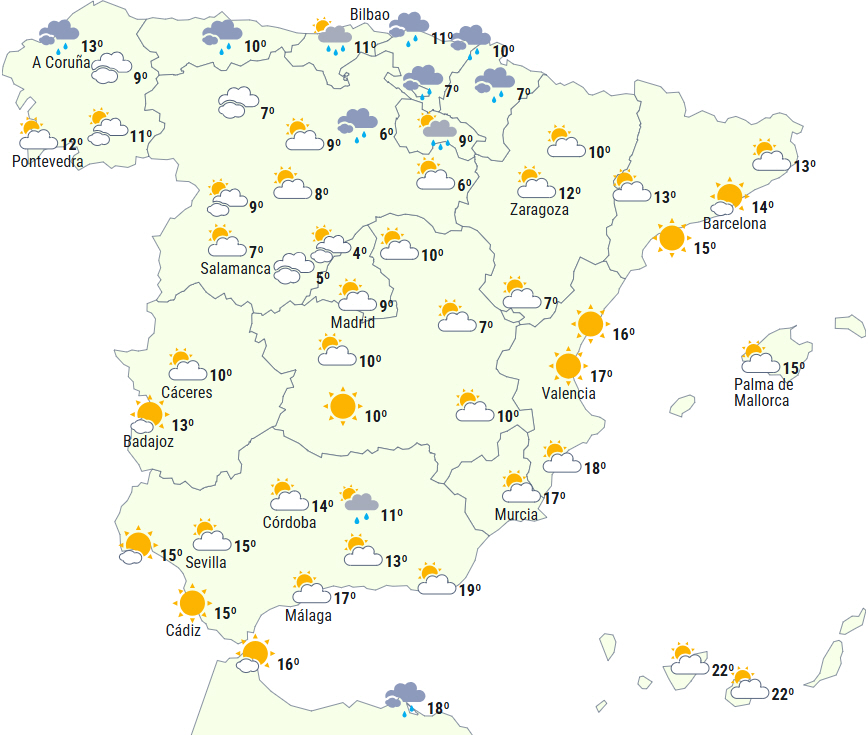 Fronten fra den foregående dag vil afslutte sin passage og give meget skyet eller overskyet himmel over størstedelen af Den Iberiske Halvø og De Baleariske Øer med opklaring om eftermiddagen undtagen helt i nord, højtliggende områder på den nordlige halvdel af halvøen og på øgruppen. Der forventes nedbør til den nordlige halvdel af halvøen og De Baleariske Øer og i løbet af formiddagen også på den sydlige halvdel i takt med frontens passage. Vi kan dog heller ikke udelukke en enkelt svag byge om eftermiddagen.
