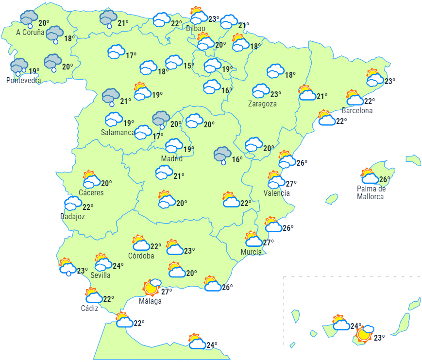 Lokalt vedvarende og kraftige byger forventes i en stor del af Galicien, mere sandsynligt på Atlanterhavskysten, de omkringliggende områder og i de centrale Pyrenæer.