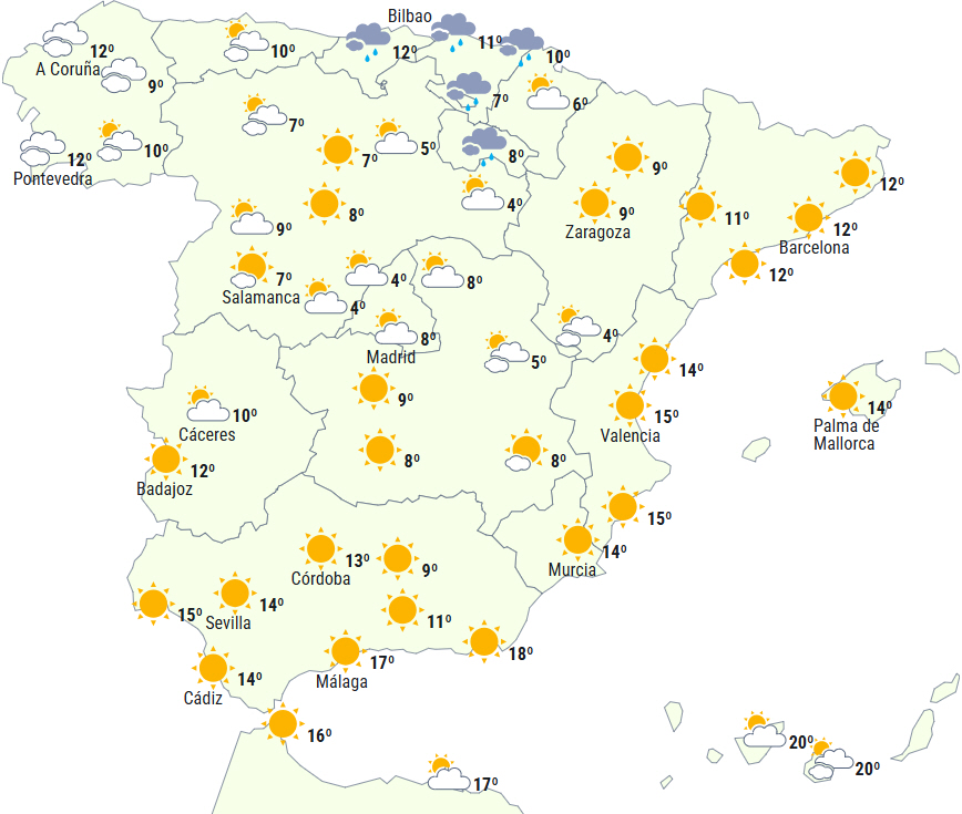 Indtrængen af højtryk fra vest giver relativt stabilt vejr på dele af Den Iberiske Halvø med overvejende klar himmel over den sydlige halvdel og i nordøst, mens der bliver skyet eller overskyet himmel over resten, dog efterhånden tendens til opklaring i det nordlige højland og i De Iberiske Bjerge.