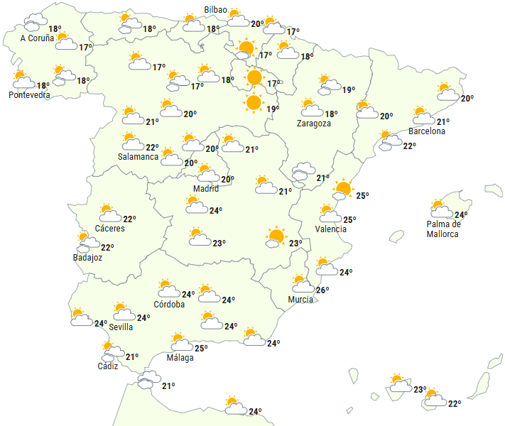Stabilt vejr i størstedelen af landet med overvejende klar himmel eller letskyet med højtliggende skyer, der trænger ind i løbet af dagen fra vest. Kun forventes der fortsat ustabilitet i og omkring Det Baleariske Hav, hvor der ventes overskyet himmel og sandsynlighed for byger ledsaget af lejlighedsvis torden, og det påvirker helt konkret Mallorca, Menorca og kysterne af Catalonien, men det kan også nå det nordlige af Comunitat Valenciana i dagens første timer.