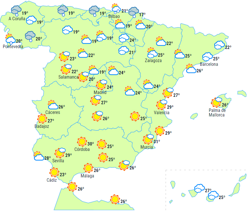 Dagstemperaturerne stiger på den østlige halvdel af fastlandet og i de højtliggende områder på De Kanariske Øer, mens de falder på den vestlige del af halvøen. Minimumstemperaturerne er generelt uændrede.