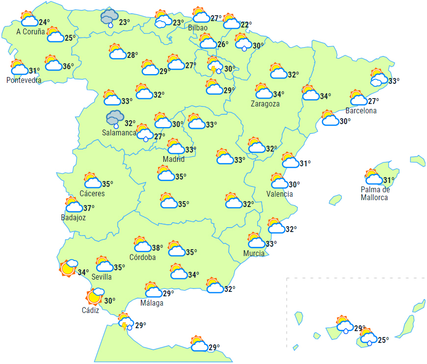Minimumstemperaturerne vil stige på den nordvestlige del af fastlandet og falde i centrum. Temperaturerne kan dog stadig overstige 34 grader i det østlige Andalusien og i de nordøstlige dale.