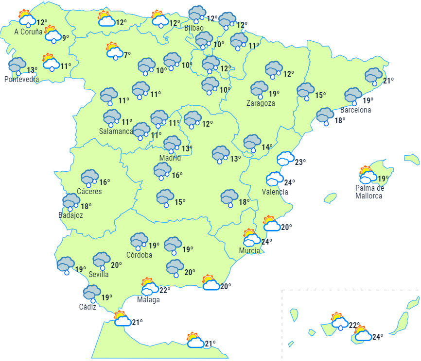 Halvøen forventes at være under indflydelse af et lavtryk, som giver overvejende skyet eller overskyet himmel og let nedbør, der påvirker de atlantiske og cantabriske områder, såvel som området omkring den øvre Ebro-dal og Pyrenæerne, hvor nedbøren falder som sne. Sidst på dagen vil nedbøren have tendens til at intensivere i nordvest.