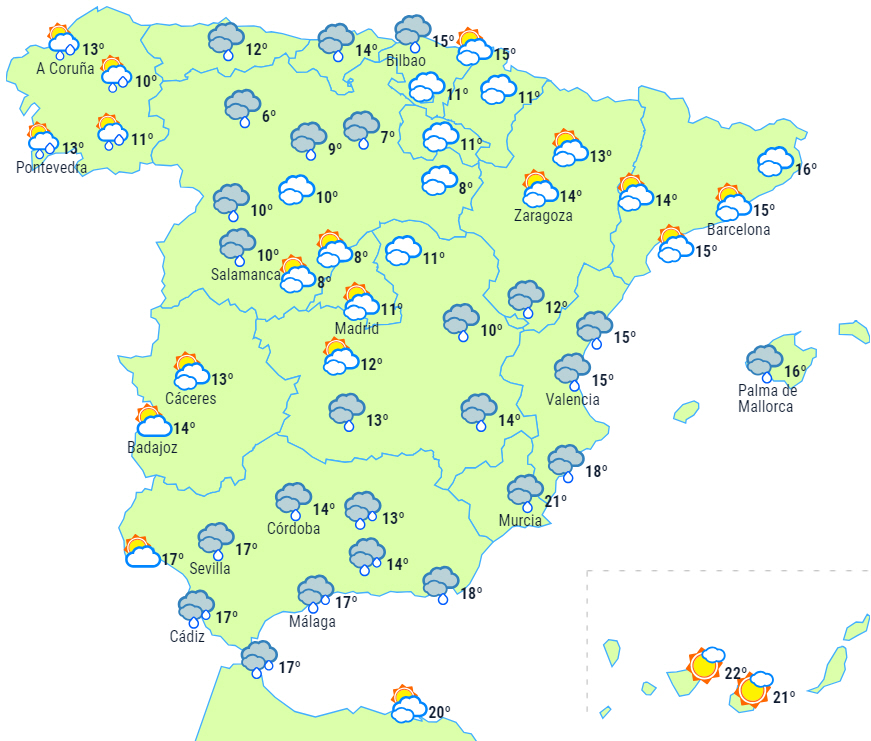 Regnen aftager efterhånden i nord, undtagen i Galicien, hvor de fortsat vil være spredte og lejlighedsvise på grund af en anden front, der banker på. Nedbøren kan falde som sne i Pyrenæerne.
