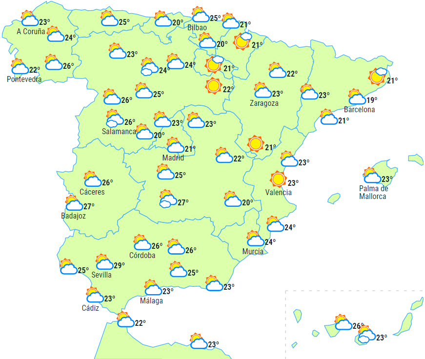 Letskyet i begyndelsen af dagen på resten af halvøen og Balearerne, bortset fra nogle perioder med lavthængende skyer i dele af halvøens Middelhavskyst, og i løbet af dagen tiltagende skydække.