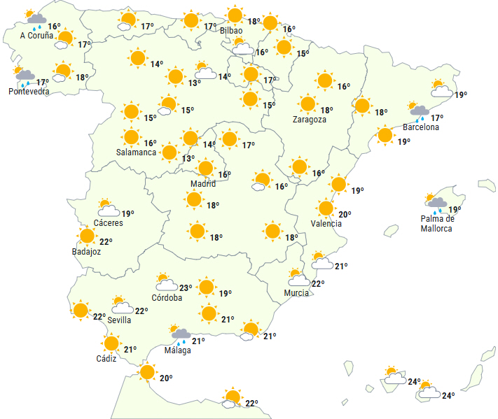 Vejret er stabilt i det meste af Spanien med solrigt vejr, dog er der risiko for regn i Middelhavsområdet.