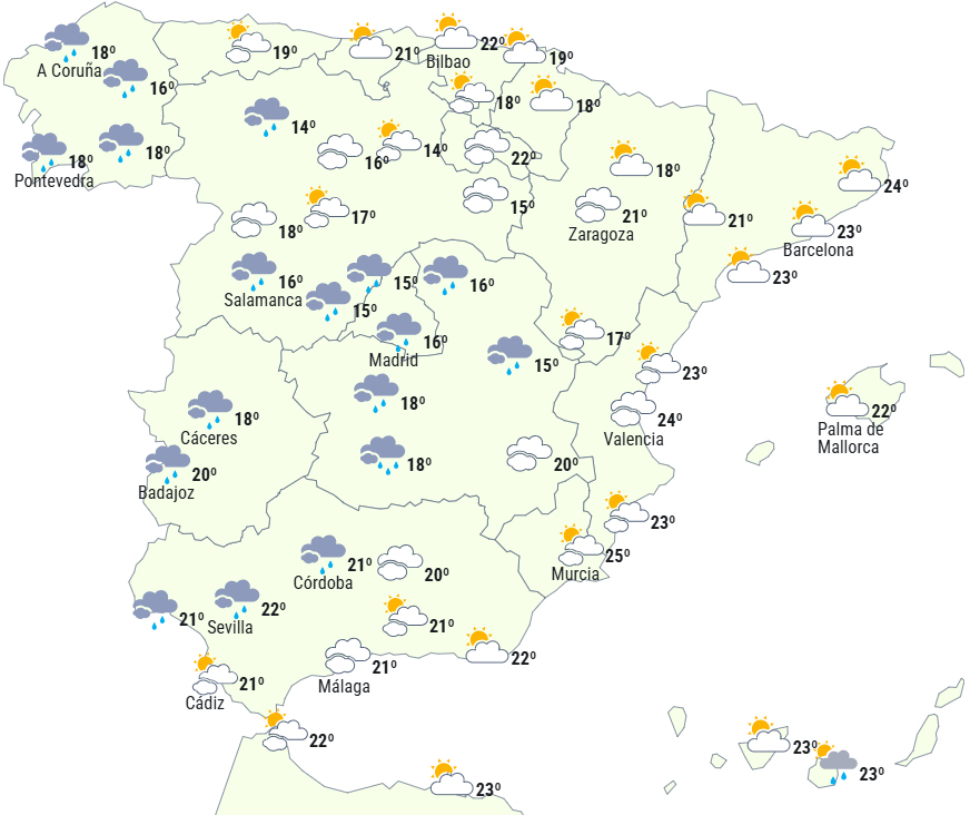 Resterne af de lavtryk, som påvirkede Den Iberiske Halvø onsdag, vil flytte sig mod øst, samtidig med at et atlantisk vejrsystem med en front vil trænge ind fra vest om eftermiddagen.