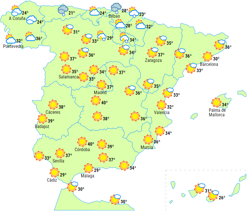 Varsler om høje temperaturer til det meste af halvøen, Balearerne og De Kanariske Øer.