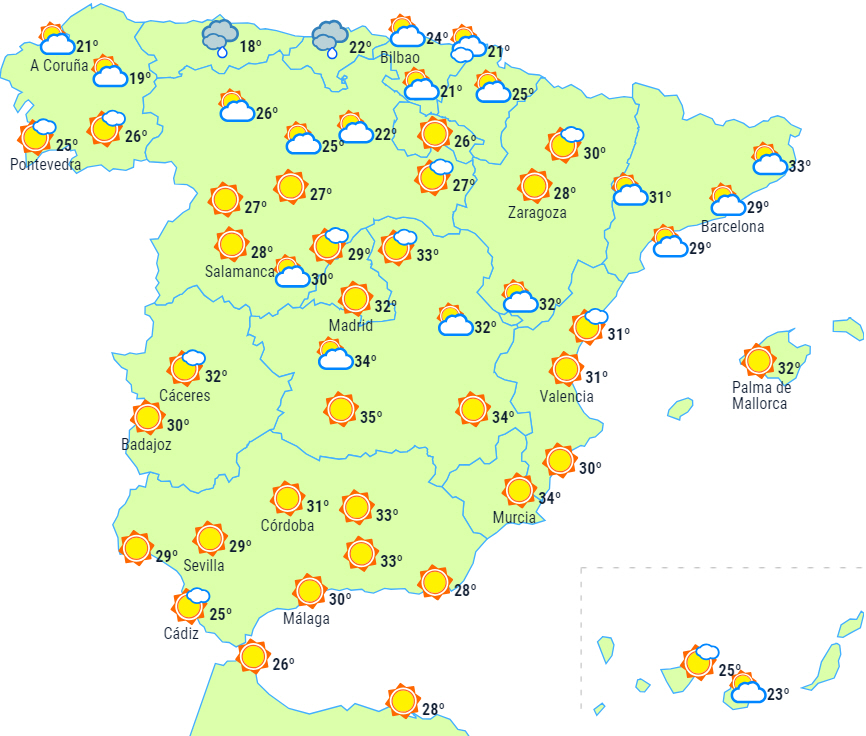 Maksimumstemperaturerne vil ikke opleve store ændringer, bortset fra fald i de højtliggende områder på De Kanariske Øer, det østlige Cantabrien og det nordlige Galicien. Temperaturerne vil forblive over 35 grader i de fleste indlandsområder på den sydlige halvdel og det nordøstlige af halvøen, dele af det nordlige højland og dele af Mallorca. Vi kan komme over 40 grader i dalene på den sydlige halvdel af halvøen og dele af La Mancha.