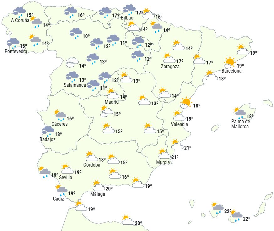 Passagen af frontsystemer kombineret med dannelsen af et lavtrykssystem i det nordlige Middelhav vil give en dag præget af ustabilitet på Den Iberiske Halvø og De Baleariske Øer, med skyet eller helt overskyet himmel. Om eftermiddagen er der dog tendens til opklaring.