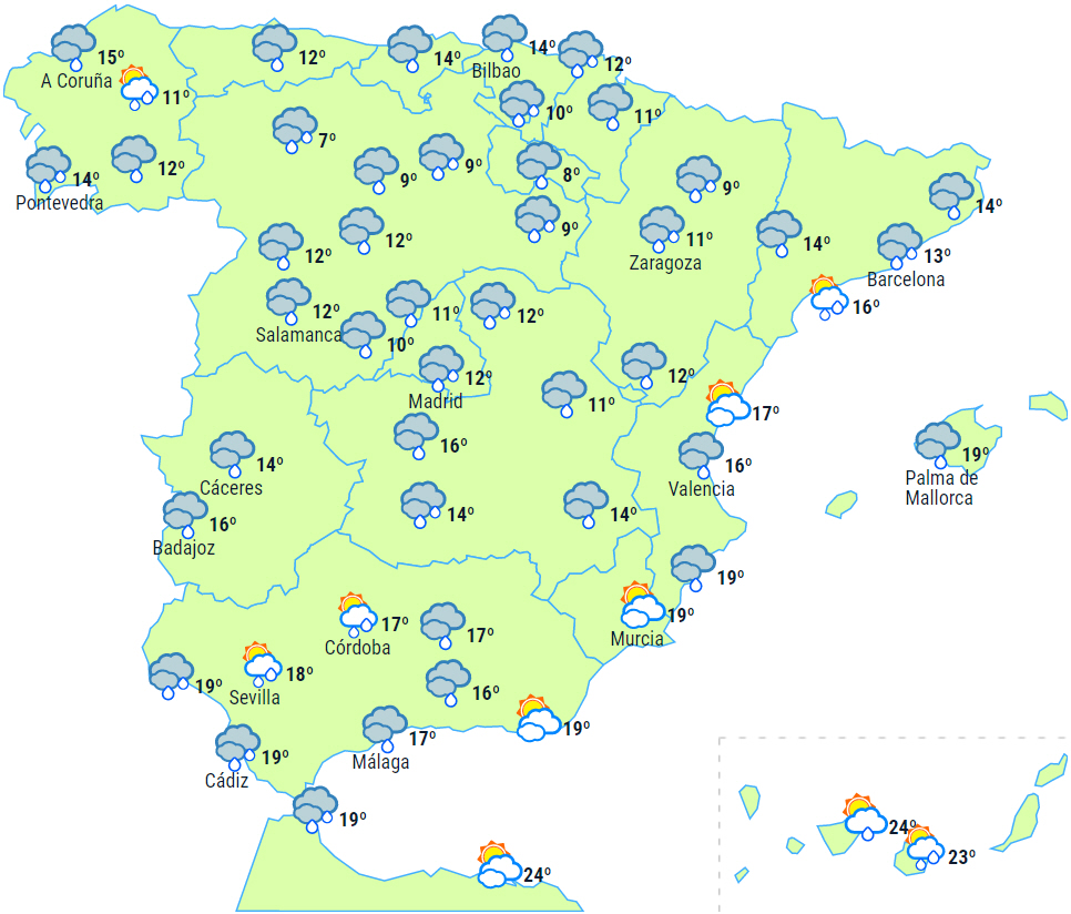 Skyet eller overskyet vejr med udbredt regn. Der kan forekomme kraftige og vedvarende byger i store dele af Atlanterhavsområderne, det nordlige Aragón og Catalonien samt på den galiciske kyst.