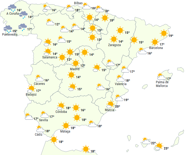 Kun letskyet eller overskyet himmel over den nordvestlige tredjedel af halvøen og i bjergene på den nordlige Atlanterhavsside, der en Atlanterhavsfront nærmer sig, og det vil give svag nedbør i Galicien og det vestlige af det cantabriske område.