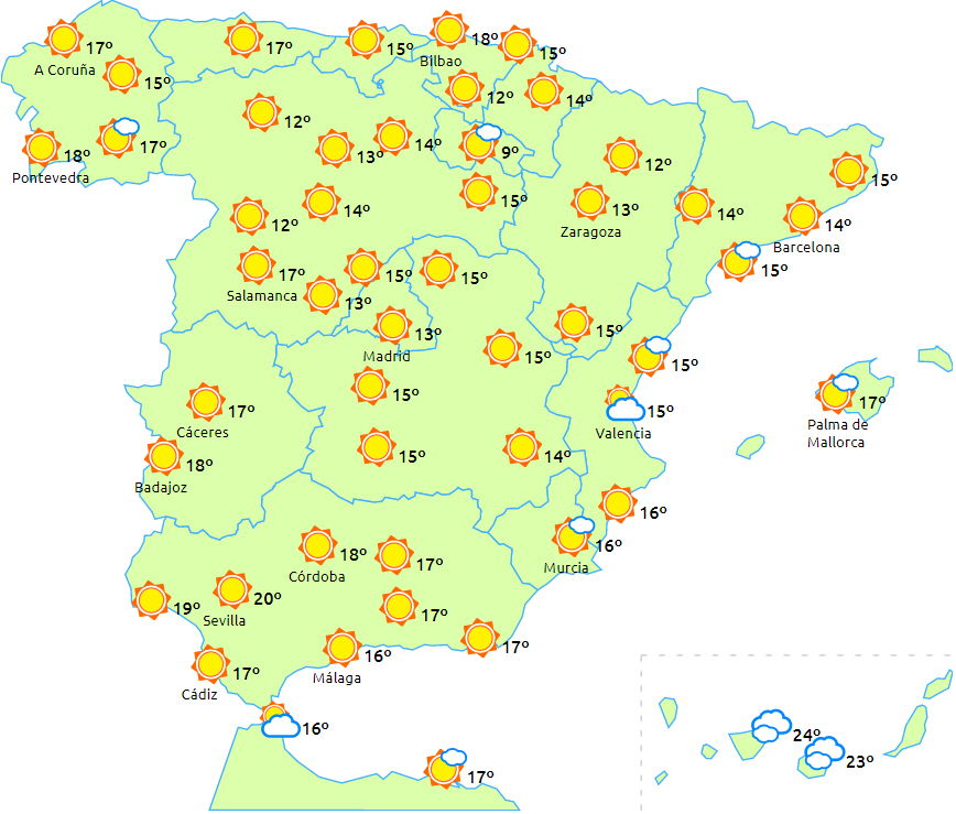 Dagstemperaturerne vil stige ved nordvestkysten og den nordlige højslette, og vi har ret høje niveauer for årstiden på De Kanariske Øer og Atlanterhavssiden. Nattemperaturerne vil falde på den nordlige højslette og i det sydøstlige indland og stige i bjergene på den nordlige halvdel. Der vil fortsat være svag frost i Pyrenæerne, på den nordlige højslette, i De Iberiske Randbjerge og i det sydøstlige af halvøens indre egne.