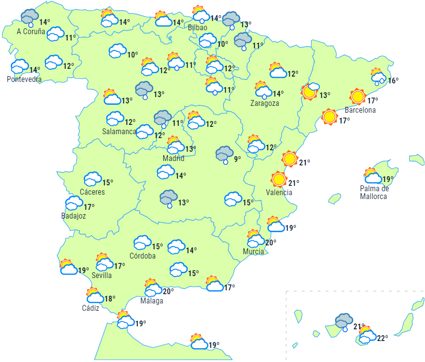 Nedbøren vil i første omgang ramme den nordvestlige halvdel af halvøen og sprede sig fra vest mod øst, efterhånden som fronten bevæger sig frem, for til sidst at ramme den nordøstlige del og de nordlige områder af De Baleariske Øer.